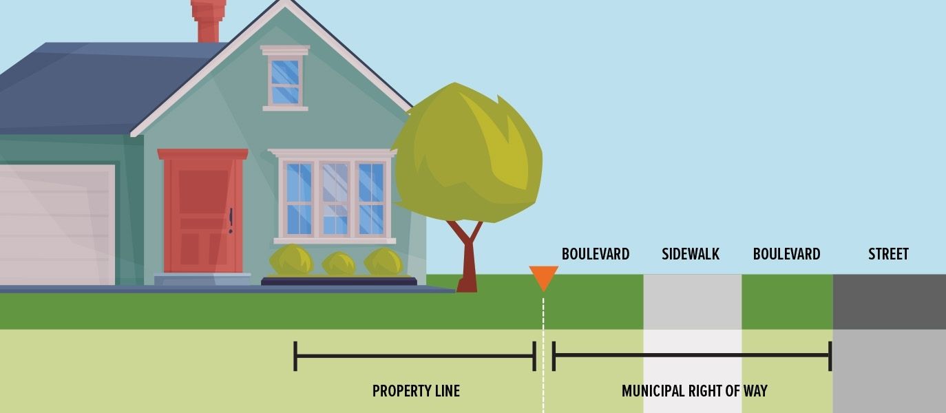 To understand where a property line ends and a municipal right-of-way begins, residents can view approximate property lines online by using the Geographic Information System. The water shut-off valve (CC valve) is usually located near the property line, and anything between that point and the roadway is typically part of the City’s right-of-way.