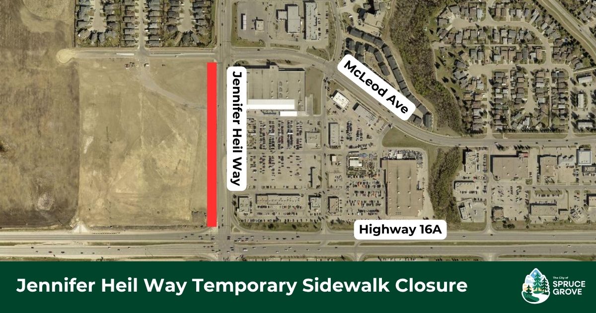 The sidewalk along the west side of Jennifer Heil Way between Highway 16A and McLeod Avenue will temporarily be closed for two weeks starting Monday, April 20.