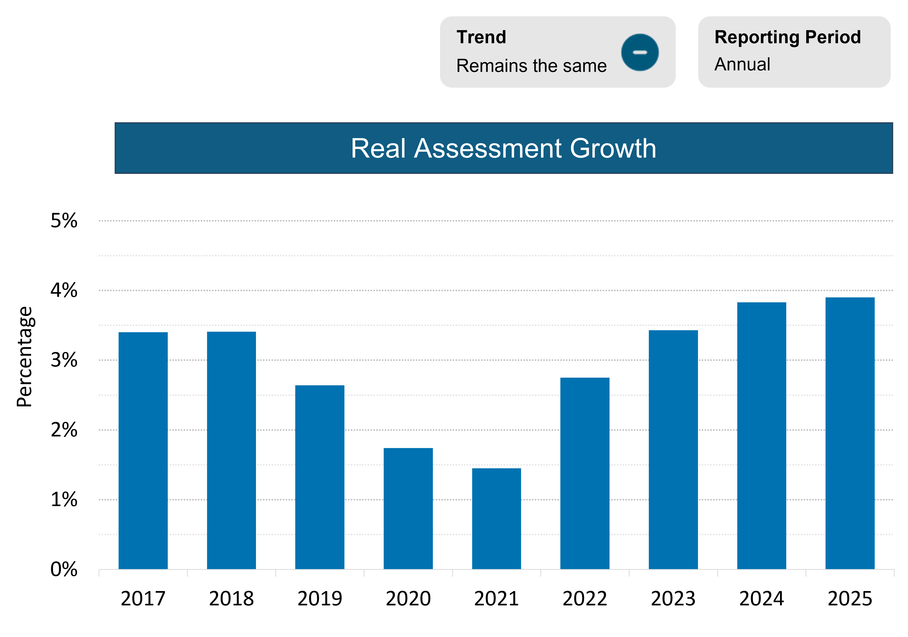 It is measured to assess the growth in the residential vs. non-residential sectors and provides insight on achieving financial sustainability and maintaining reasonable and competitive levels of taxation.